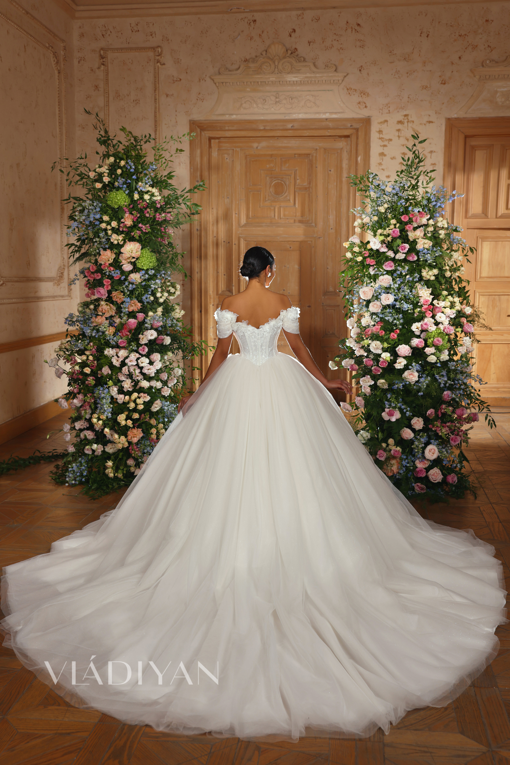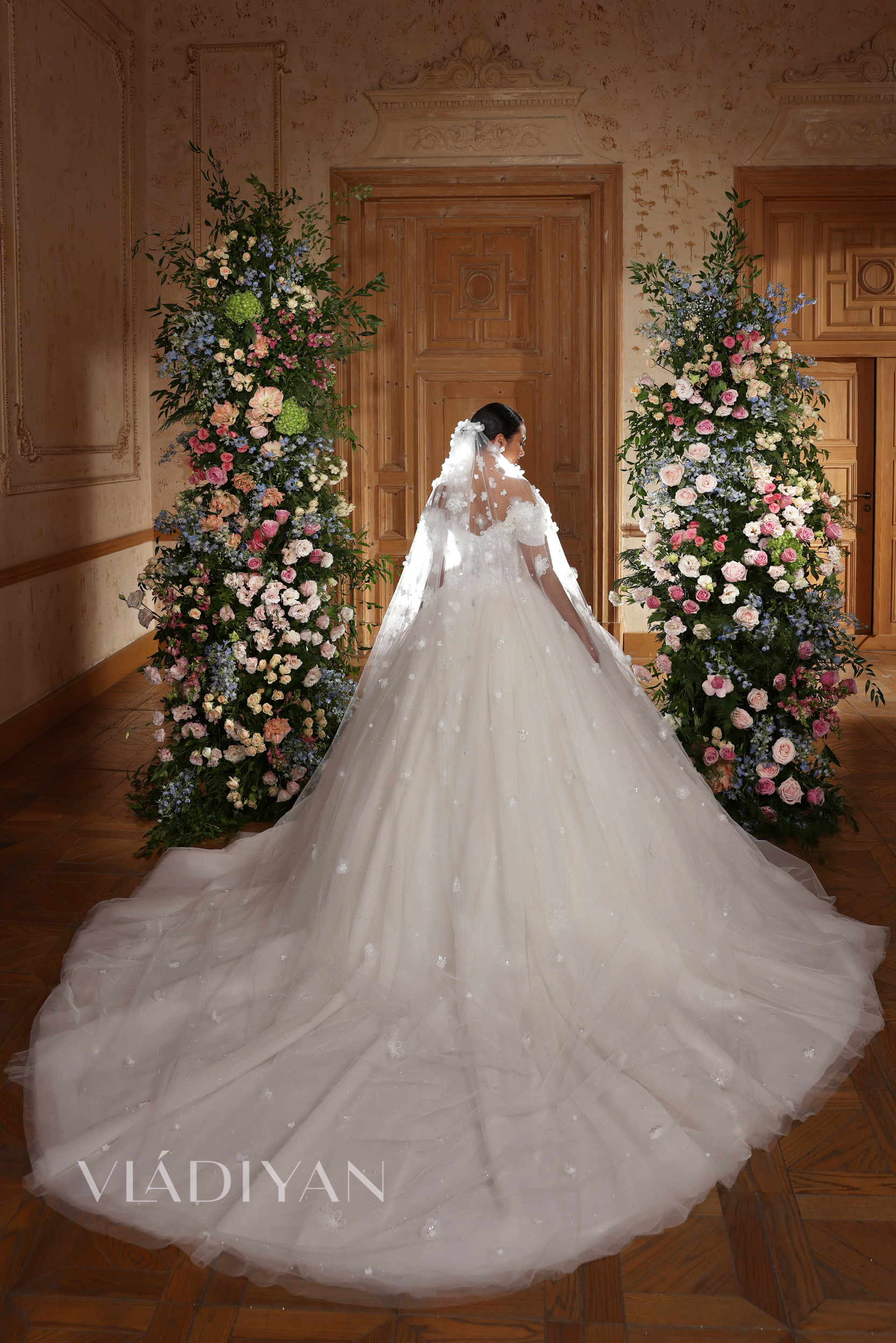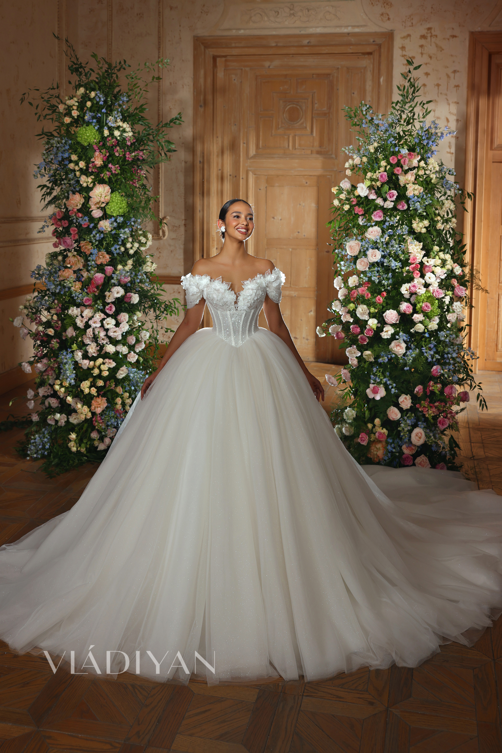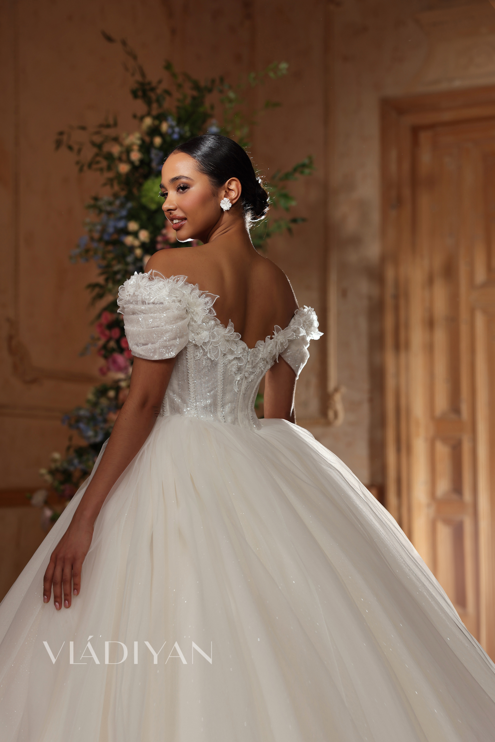 HC2525 – Puffy princess-cut dress featuring a triangle-shaped corset and off-shoulder sleeves adorned with delicate 3D flowers and beading.