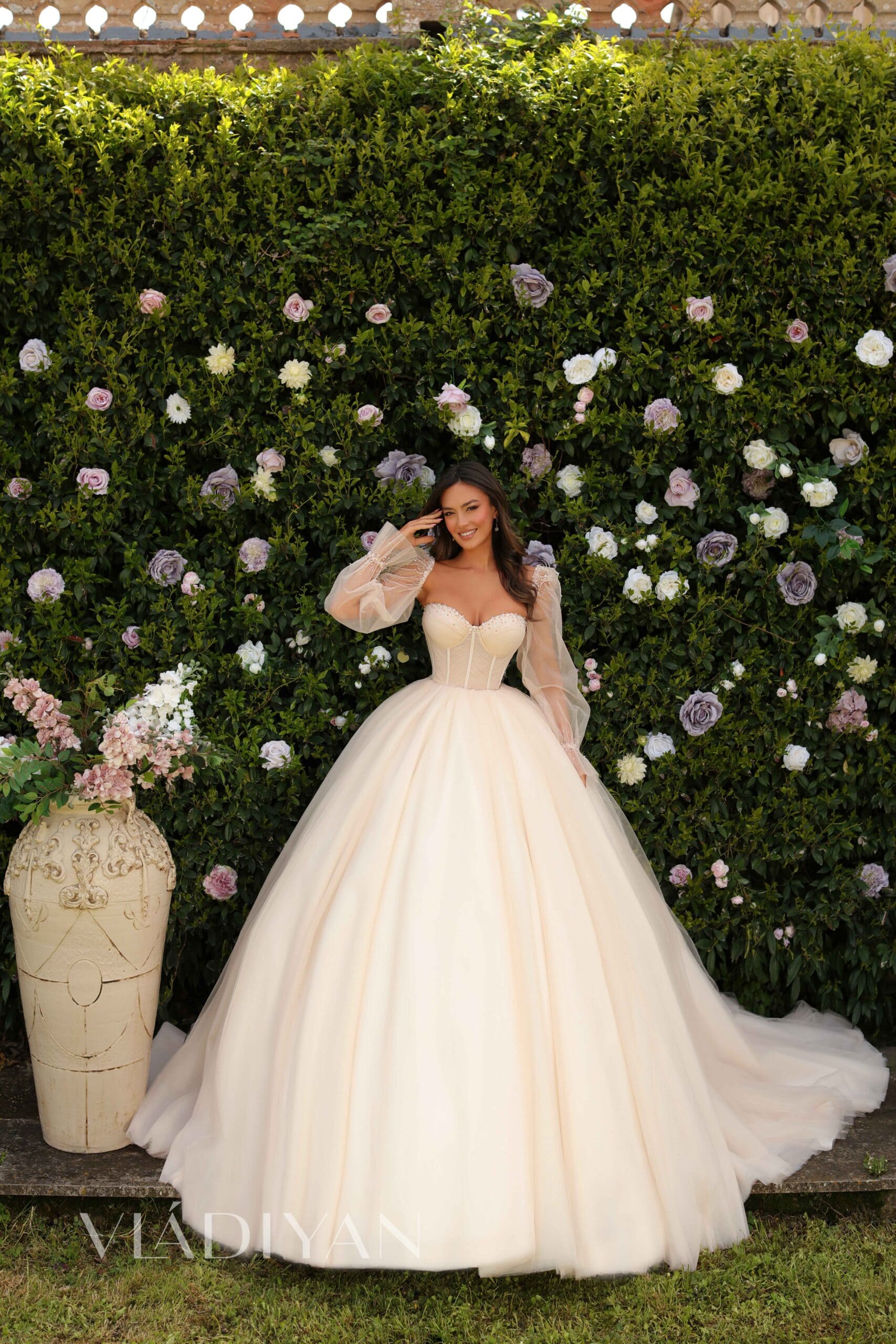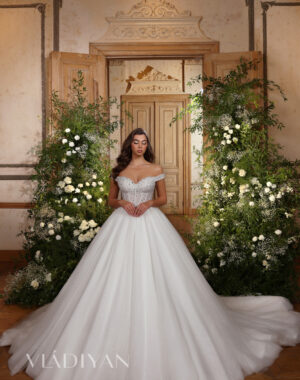 TS2406 – This dress is sewed of weightless tulle fabric. The fitted bodice is adorned with beads and crystals. Puffy skirt passes into a train. Detachable sleeves are made of sheer fabric that flow beautifully with every movement.